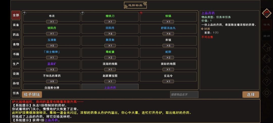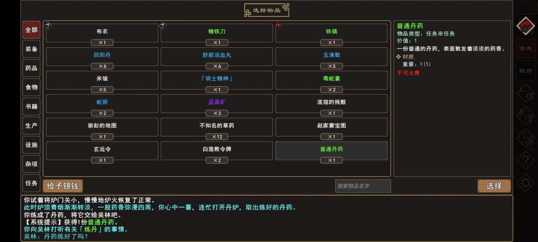 (4)炼丹房→丹炉,选择炼丹,按照提示的颜色选择对应的选项([吴林]对话 炼丹火候,有提示),获得:[普通丹药※任务]/[上品丹药※任务](小概率失误会扣100银钱)。