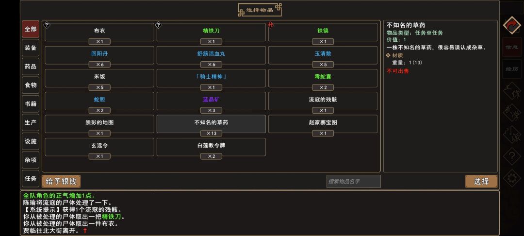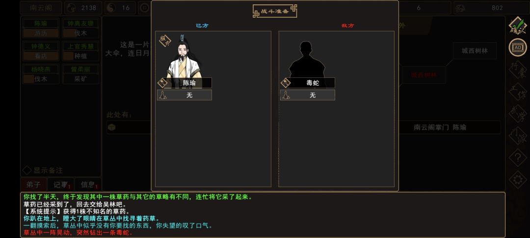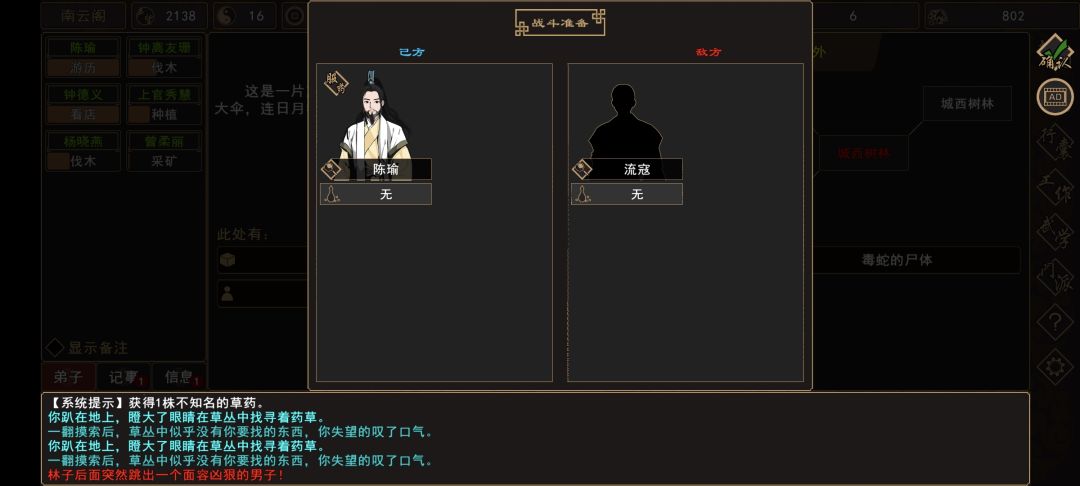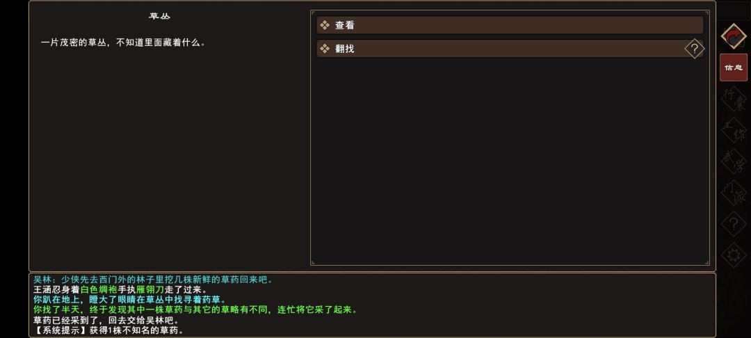 (2)前往 扬州城外→城西树林→草丛,选择翻找,获得:[不知名的草药※任务]×1;建议暂停采集到没有体力,可以节省时间;翻找概率刷新[毒蛇]、[流寇],会自动触发战斗(可以多次存档sl)。