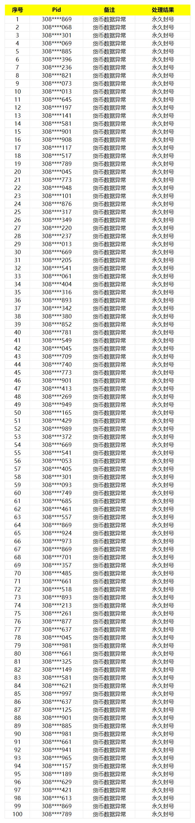 本次行动针对部分渠道账号进行核实,从严查处游戏内数据异常行为,市政工已收集了相关违规账号信息,并对这些玩家进行了永久封号处理,将于此公告中予以公示。