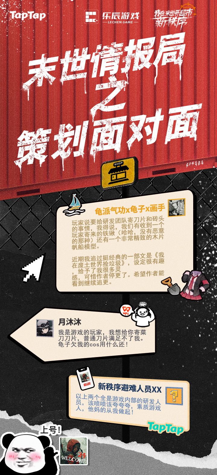 最后又回到我阿乐啦,就如策划大大所说,非常感谢大家对《我在末世开超市:新秩序》的期待和支持,阿乐也非常期待大家在测试体验到游戏后给我们提多多的建议,所以在和策划大大交流完后,我又努力为大家争取到了3份游戏周边。大家只需在本帖下方留下你们对游戏的期待即可参加活动啦~