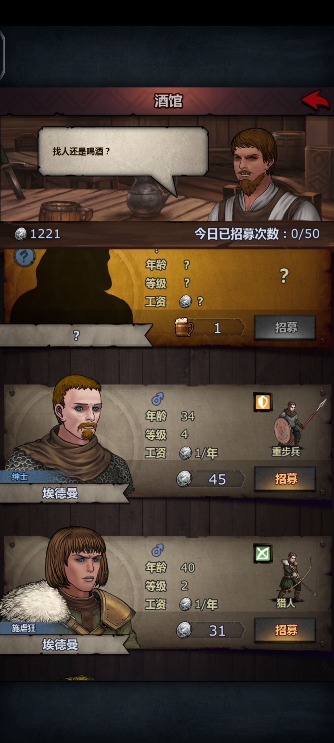 (图4)打完了你得到了第5个工具人,这个时候你终于可以看到酒馆了,看见酒馆带有,淑女/绅士/英武(男性)/迷人(女性)直接买下备用。