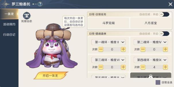 主界面点击冒险-左下角罗三炮,可以进入罗三炮委托界面,调整好需要完成的事项和难度,罗三炮就会自动开始执行一条龙了。非氪金玩家推荐心影试炼的难度调低一点,以免刷新不到 对应品质的任务而跳过。