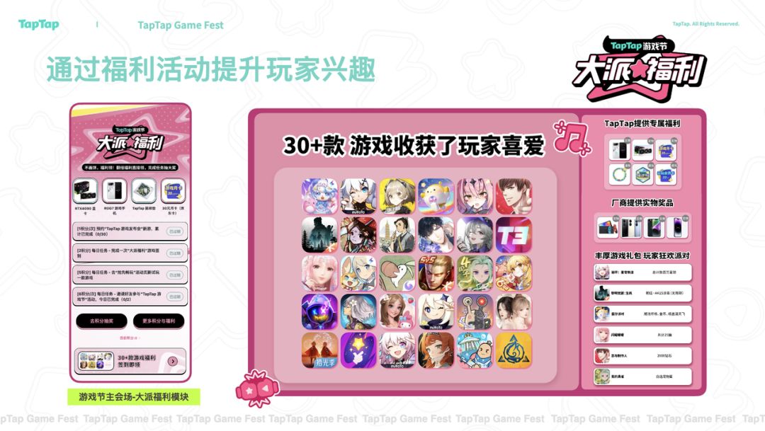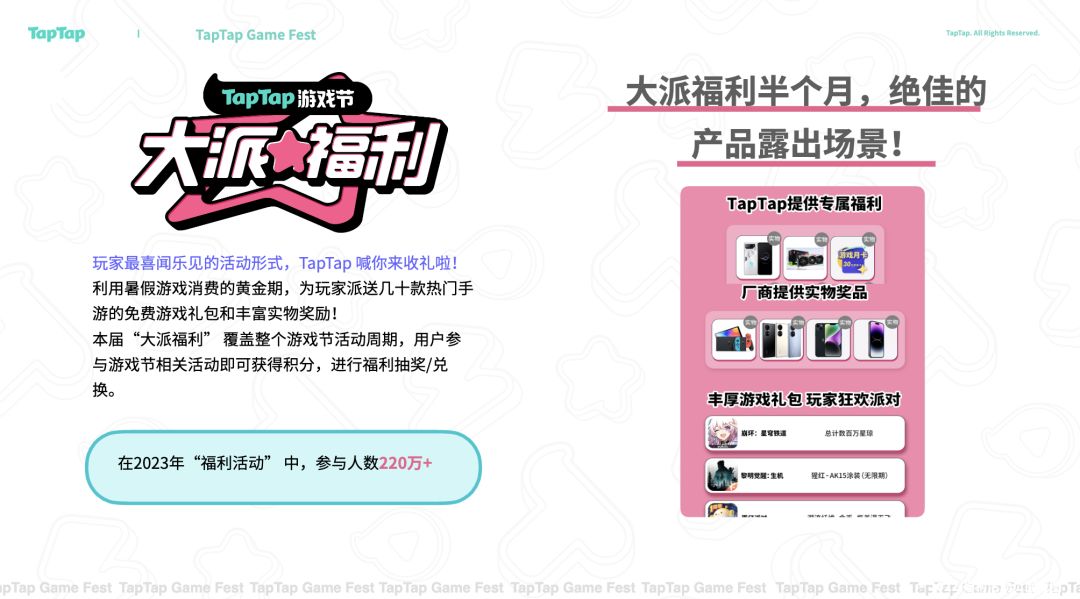 TapTap 游戏节是 TapTap 每年曝光最多,用户回馈力度最大,拉新效果最好的福利向活动,共包括「TapTap 游戏发布会」、「抢先畅玩」、「大派福利」三个会场。