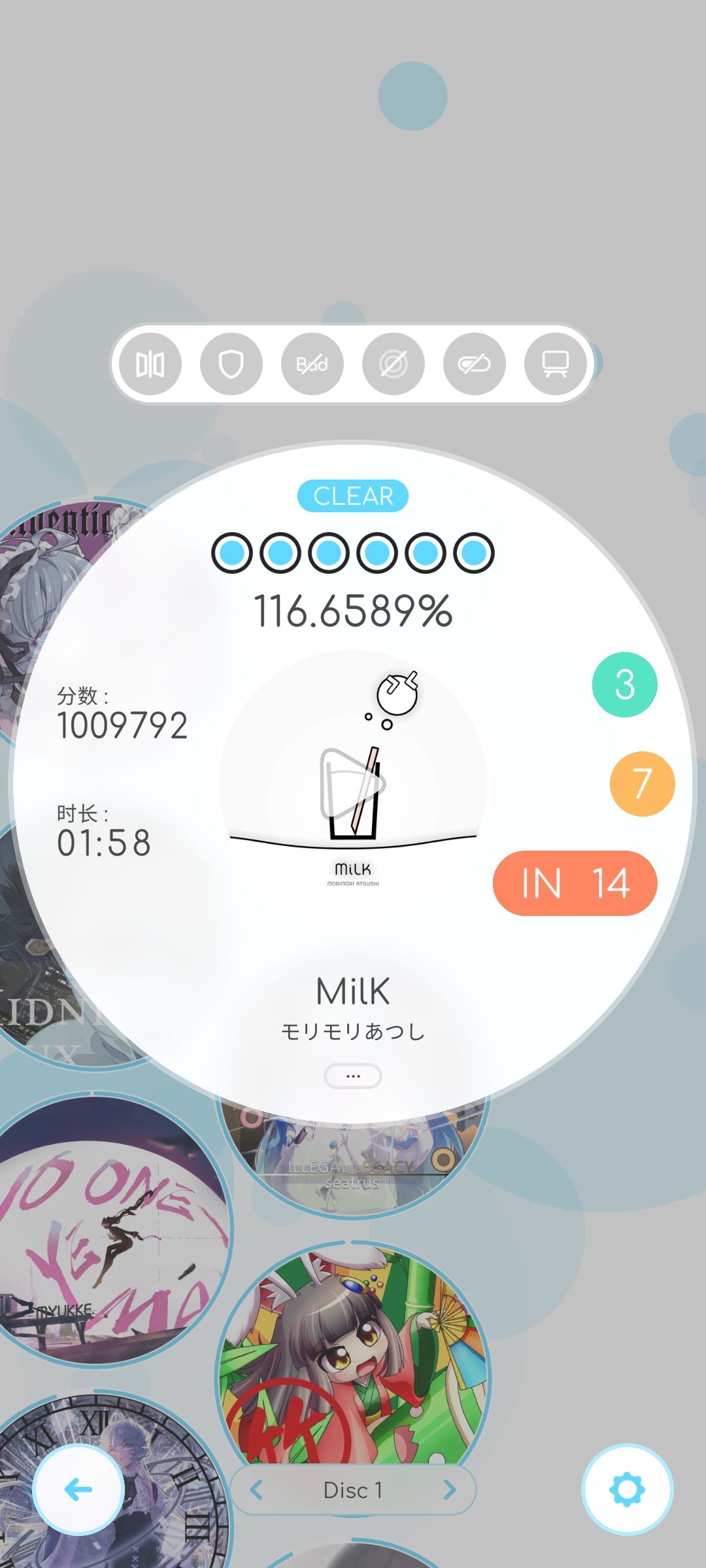 点击圆盘中心的播放便可以开始游玩了。此外要注意,当任意Note获得Miss判定时,屏幕会跳出灰色的长列效果(或者手指点击方位为圆心的扩散圆特效)和x,此时上方的计量条将减少,扣光时将直接退出本局并获得Not Clear评级(未开启Fail保护模式时)。