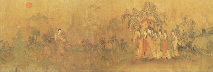 中国十大传世名画之一的《洛神赋图》原卷就是东晋著名画家顾恺之绘制的,可以称为顾恺之传世精品。这卷宋摹本在一定程度上体现了顾恺之艺术的特点,全卷分为三个部分,层次分明地描绘着曹植与洛神真挚纯洁的爱情故事。顾恺之的《洛神赋图》发挥了高度的艺术想象力,富有诗意地表达了原作的意境。此画用色凝重古朴,具有工笔重彩画的特色。作为衬托的山水树石均用线勾勒,而无皴擦,简繁得当,空间、疏密都安排的井然有序,与画史所记载的“人大于山,水不容泛”的时代风格相吻合。