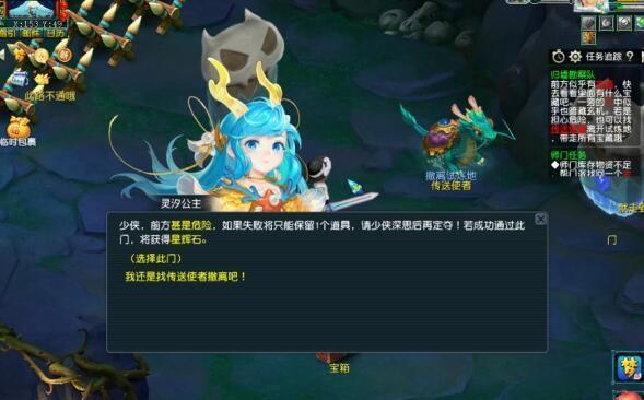 4、打开宝箱后,玩家可以选择与门交谈。与门交流后,可以得知前方的危险系数(成功率极低、万分凶险、甚是危险、有些危险、略有危险、十分安全),并了解成功通过后可以获得的物品奖励。若玩家通过门成功,将获得对应的物品奖励;若通过失败将只能保留1个道具并离开试炼场地。