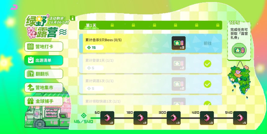 一个通过完成活动任务获取活动物品『露营礼券』用于【翻翻乐】中抽取奖励,可以和每日日常任务一块做了,以及完成活动任务后都会获取一定数额的积分,达到一定的积分目标,额外获取月亮币奖励,总共累计可以获取月亮币*15,露营礼券*150