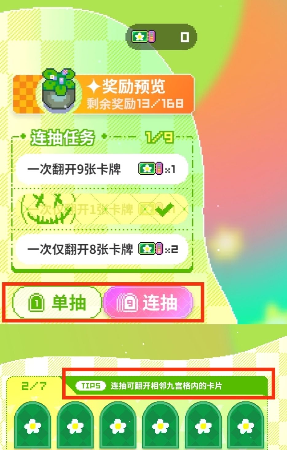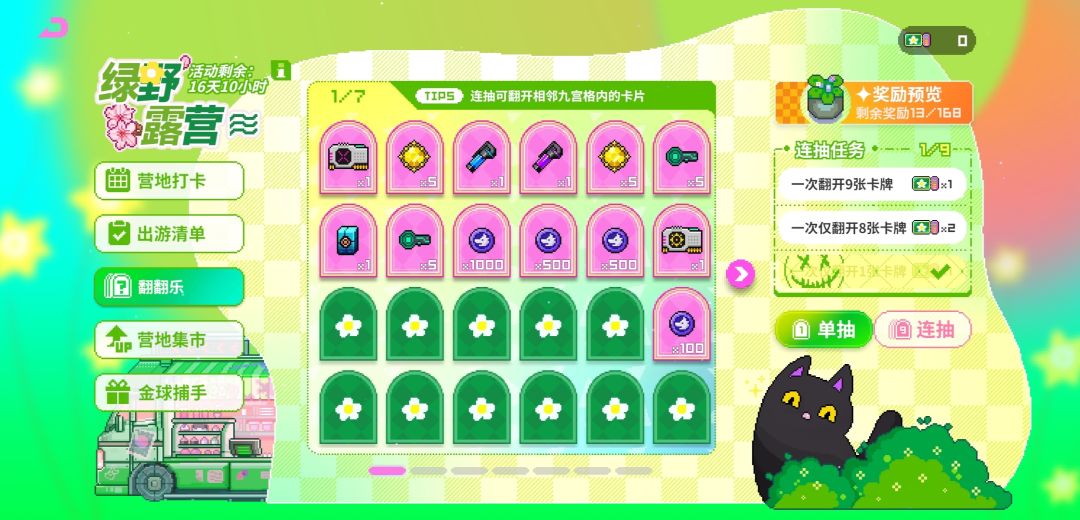 我们抽牌有单抽和九连抽以及翻牌的规则:连抽可翻开相邻九宫格内的卡片,单抽一次需要消耗一个露营礼券,以此类推如图下