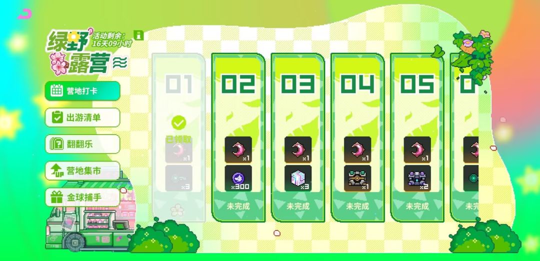 是一个以翻牌获取奖励的活动,有点像在开盲盒,你永远不知道卡片的背后是什么神秘奖励,另外我们翻牌需要完成活动的连抽任务,总共累计可以获取太阳石*25,月亮币*10,脆脆冰椰*750,露营礼卷*36