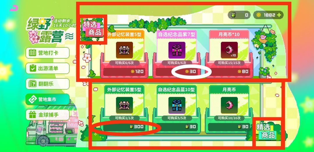 如下图我们可以看到,营地集市售卖『特选商品』和『精选商品』两种商品,消耗【太阳石】可购买『特选商品』,消耗【翠翠冰椰】可购买『精选商品』