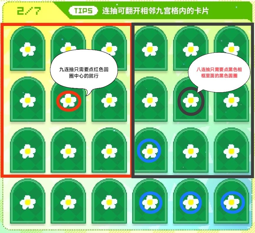 抽牌顺序优先级:蓝色的代表单抽全部点完、红色的代表9连抽、黑色的代表9连抽, 黑色的8连抽需要我们在一个九宫格左下角内先单抽1发,再进行一个连抽即可完成,如图下,如果你有更好的方法,欢迎评论区评论