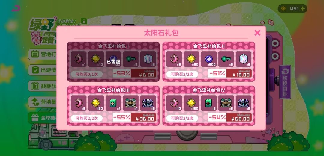 至于【金球捕手】右上角这个太阳石礼包,如果你还有首充双倍,获取【太阳石】这个礼包是肯定不划算的,如果你没有的话,这个礼包总的来说还算划算,全部买完需要花费318米,总共获取:太阳石*550,月亮币*49