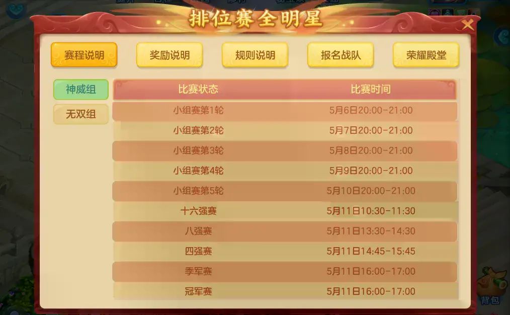 无双组将在5月13日开启小组赛第1轮比赛,5月18日开启十六强、八强、四强、季军、冠军赛。