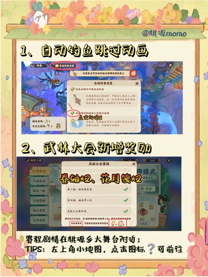 1、终于不用自动钓鱼的时候被甲级鱼动画打断而烦恼了!桃源优化了自动钓鱼设置,勾选上即可跳过动画;真正实现双手解放咯。