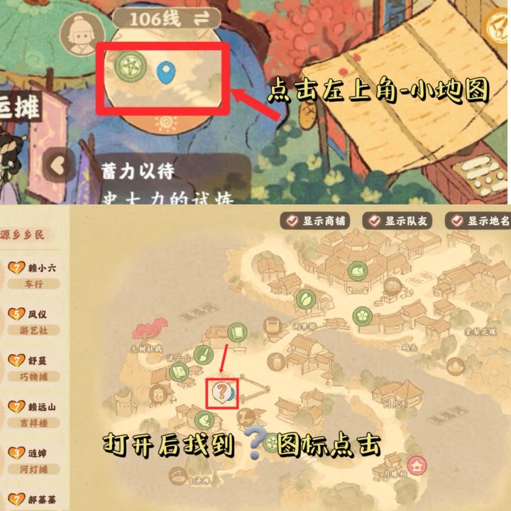 Tips:找不到活动剧情的,进去桃源乡,点开左上角地图,点击图标❔,即可前往对应地点。见图二