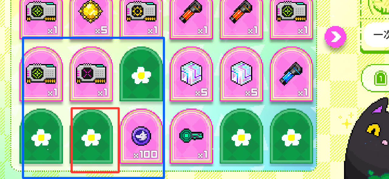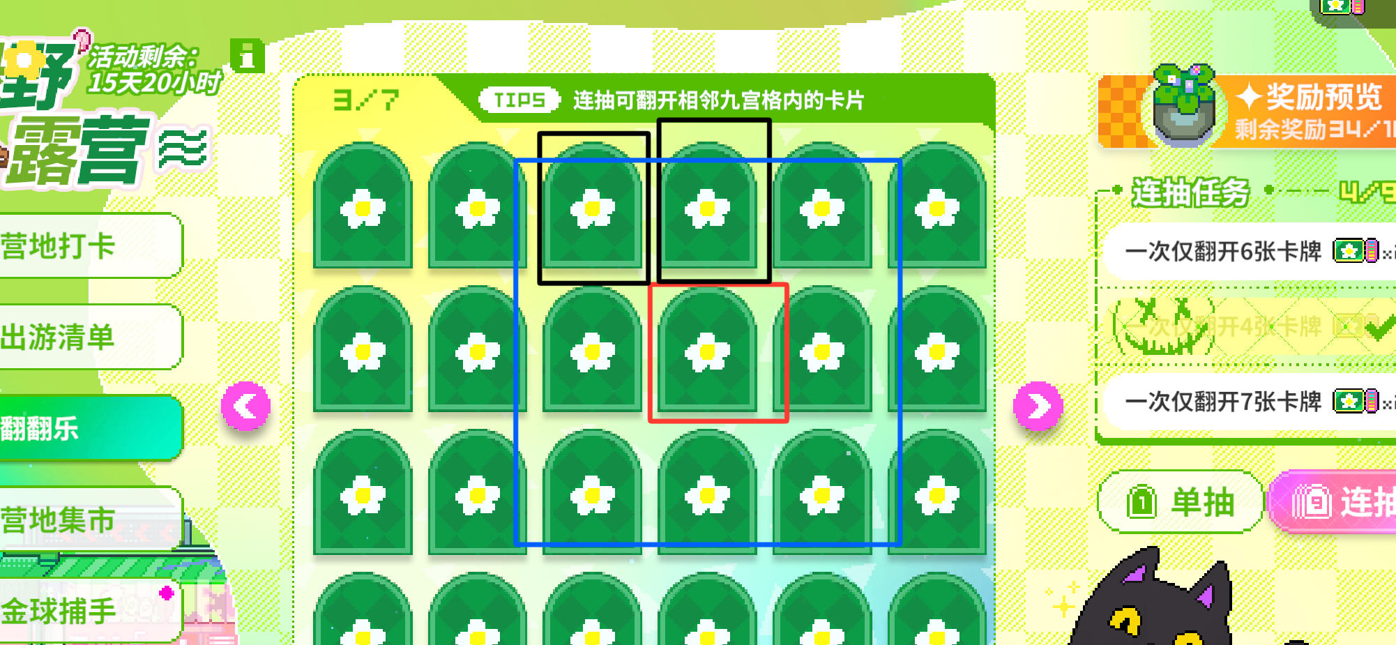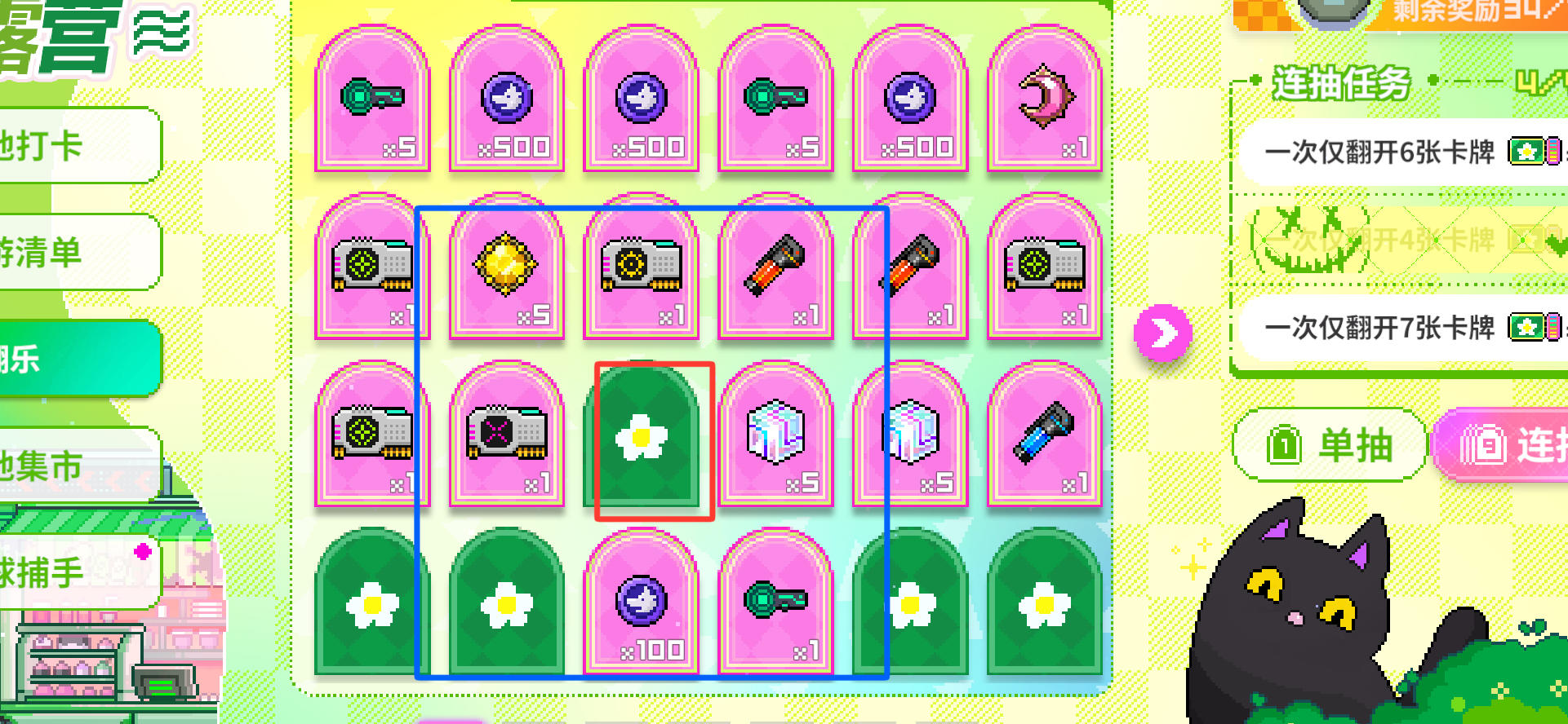 再看第四张,如果想要过一次翻开七张的任务,我们首先往后开一页全新的翻牌画面,先选择单抽,单独点击黑色圈内两张卡片,再选择连抽,以红圈为中心点击,则会一起翻开蓝圈内剩余的七张卡片,任务完成(我自己没过是因为每次进来忘记选连抽,都变成单点了,所以就比较乱套)