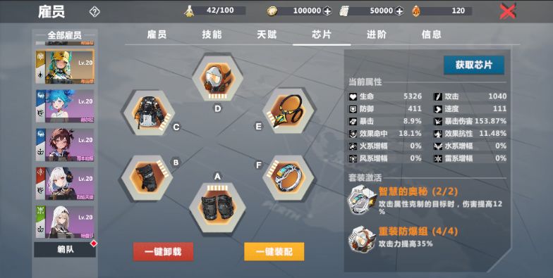 3、芯片强化:芯片强化之后,主属性是固定提升的,但是会随机提升1条副属性,所以想强出一件属性适合当前雇员的芯片还是很难得的哟4、芯片套装:芯片套装整体分为4件套和2件套两大类,4件套主要通过芯片试炼刷取,而2件套则是通过战术行动来刷取,这两大类之中具体还有多种不同的套装,大家可以根据不同的情况自行选择