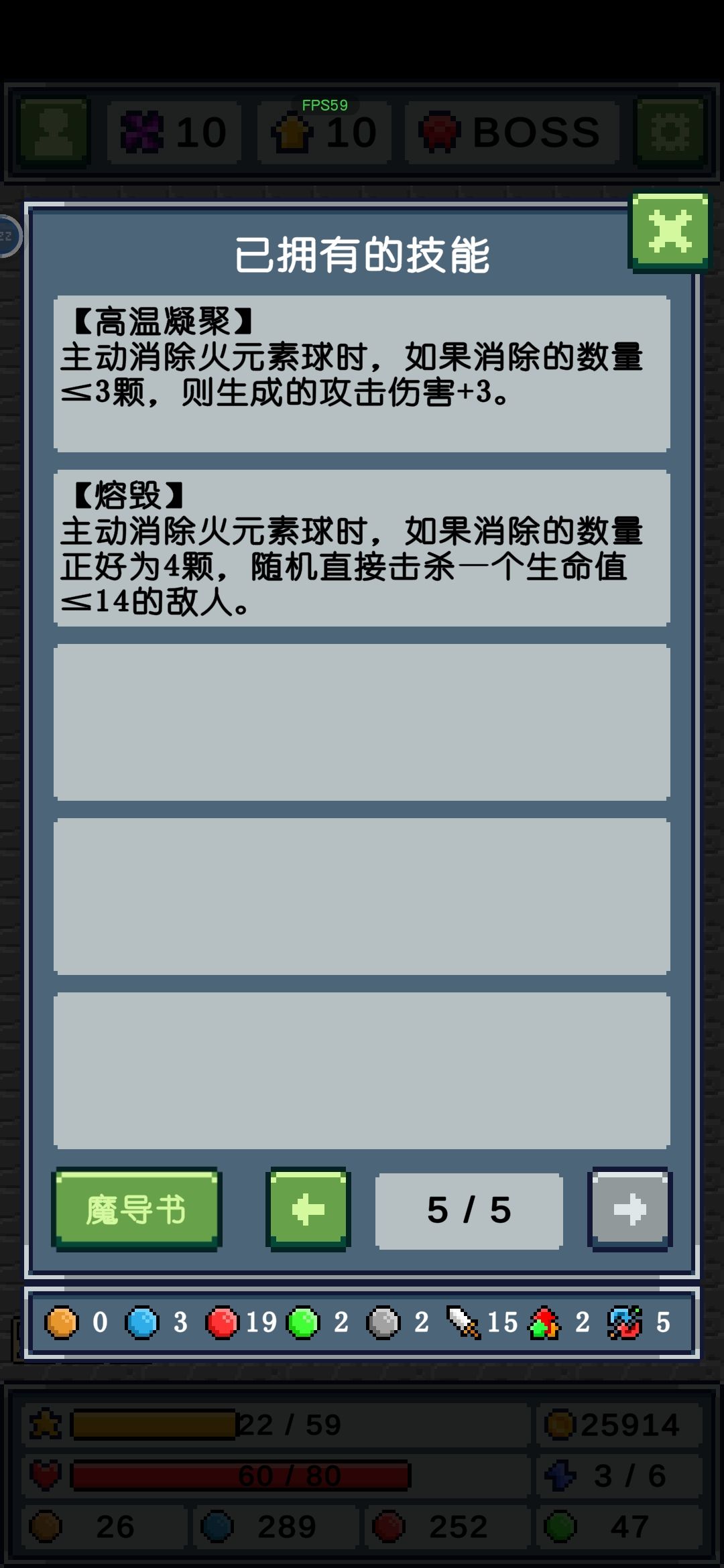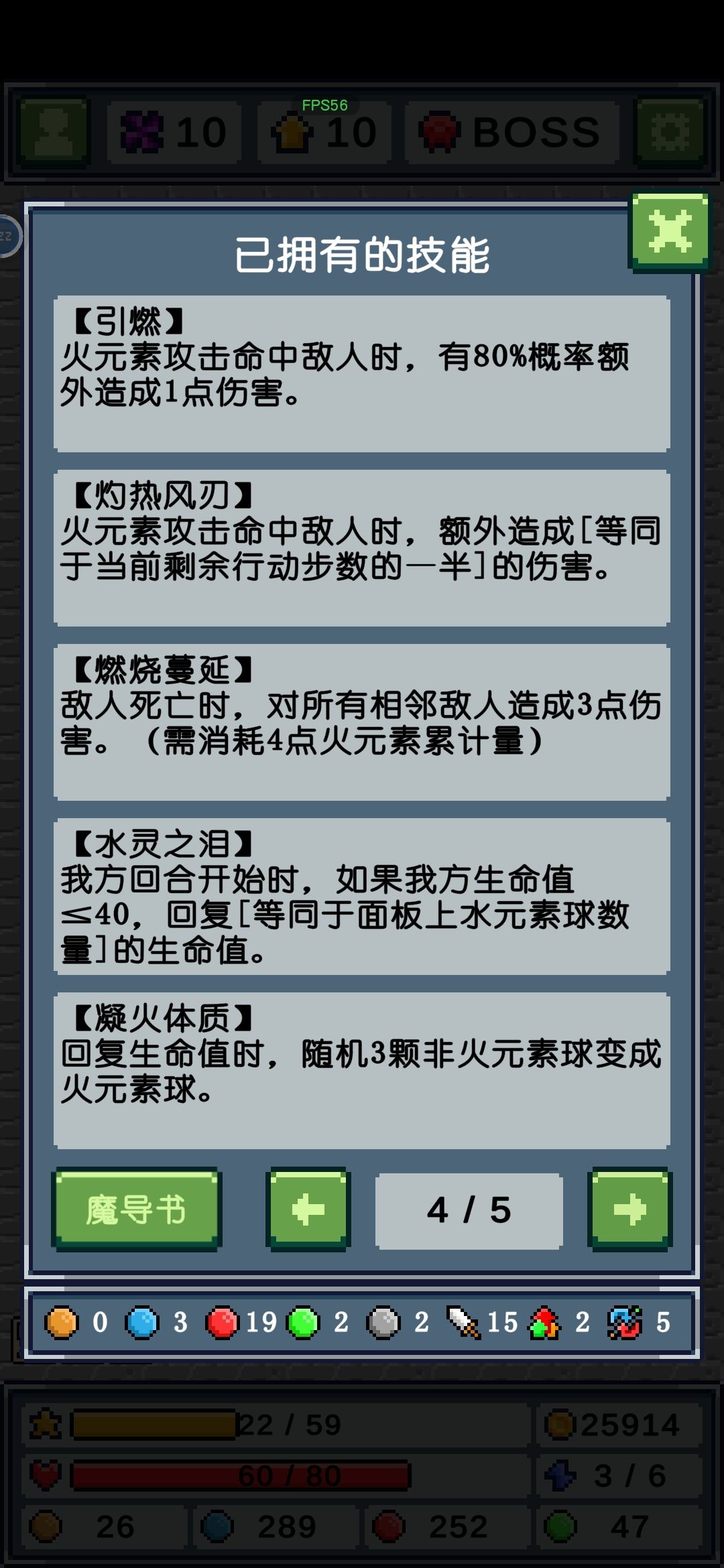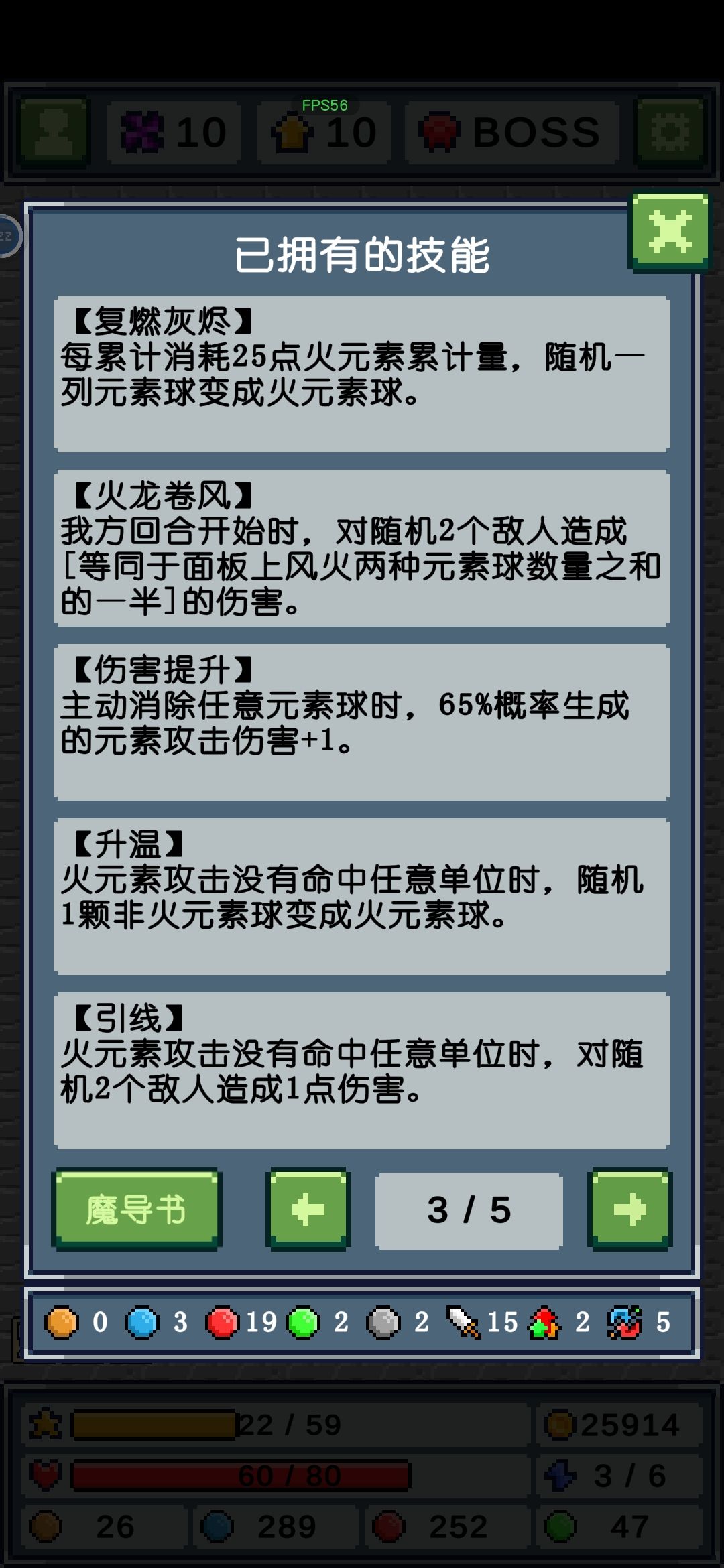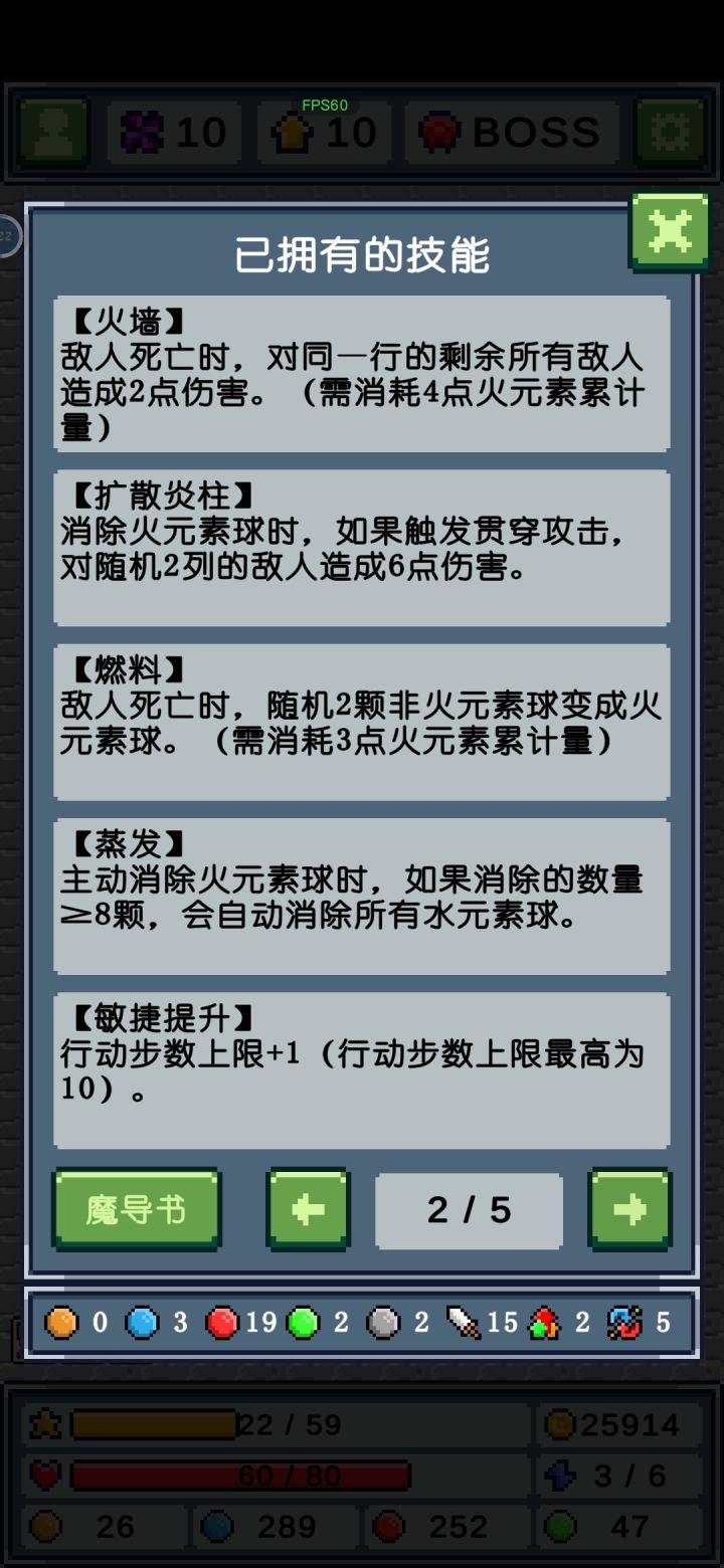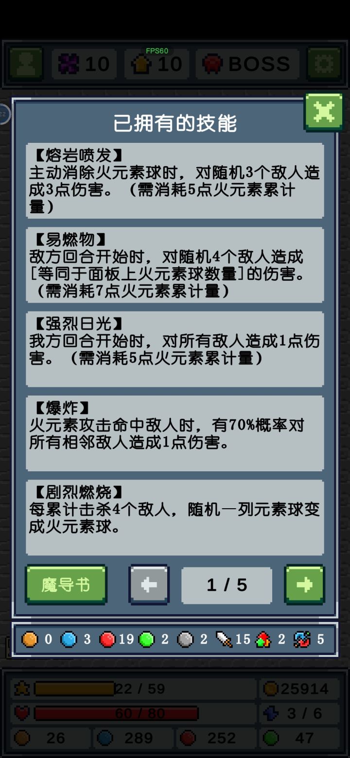 其他元素早就通关了,只打卡火元素是因为我感觉火元素前期发育过渡比其他元素难,我这是试了好几次才通关的,前期火元素特别难触发魔导书的5技能,经常都是几颗几颗在消除,导致伤害不足直接被突脸。
