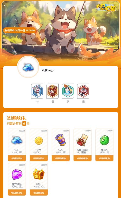 签到同时可参与集卡活动,集齐「节」、「日」、「快」、「乐」卡片即可额外兑换钻石*500!