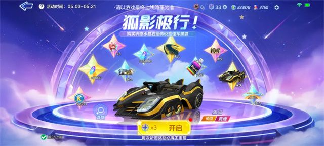 幽夜魅影,形踪难觅!5月3日起,新一期祈愿行动上线,黑狐掠影,暗夜疾行!参与活动就有机会获得全新传说竞速赛车【黑狐】、传说【黑狐仪表盘】、【黑狐印迹】、【黑狐面饰】等。