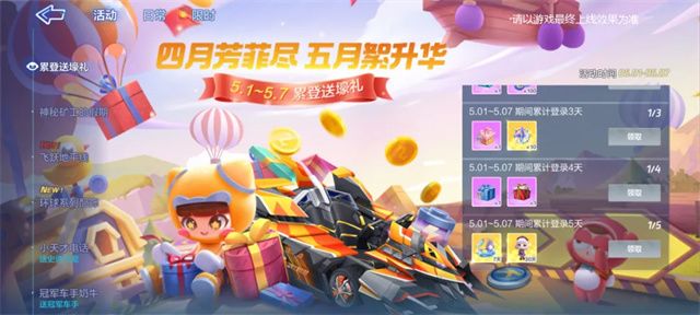 悠闲假期,黄金时刻,累登壕礼送不停!5月1日-5月7日,累计登录享丰富好礼!祈愿水晶石、限时精美车手、服饰、宠物应有尽有,美好的时间有跑跑相伴!