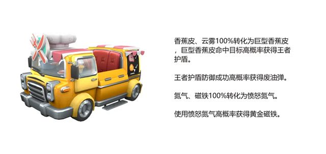 1、香蕉皮、云雾100%转化为巨型香蕉皮,巨型香蕉皮命中目标高概率获得王者护盾。