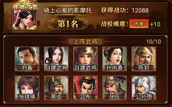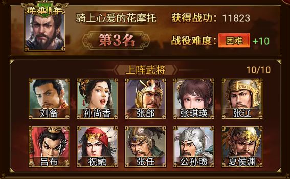 在本次小沛之战(新)中 骑上心爱的影摩托 军团以 12088 的战功摘得桂冠,通关战役 困难+10 ,恭喜!