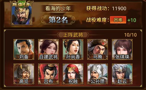 位居第二的是 看海的少年 军团,以 11900 的战功,成功攻破 困难+10!