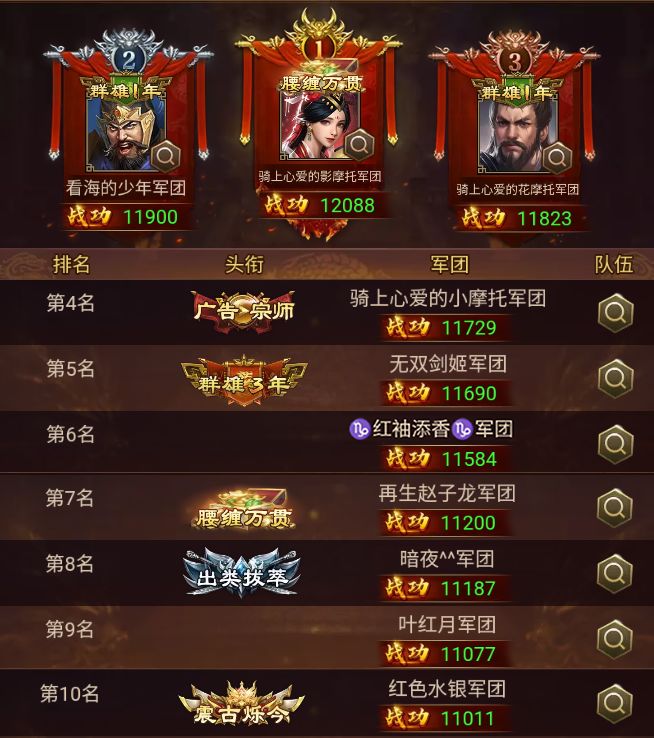 排行榜中,最终通关 困难+10 并拿下高战功的军团为:骑上心爱的影摩托、看海的少年、骑上心爱的花摩托、骑上心爱的小摩托、无双剑姬、红袖添香