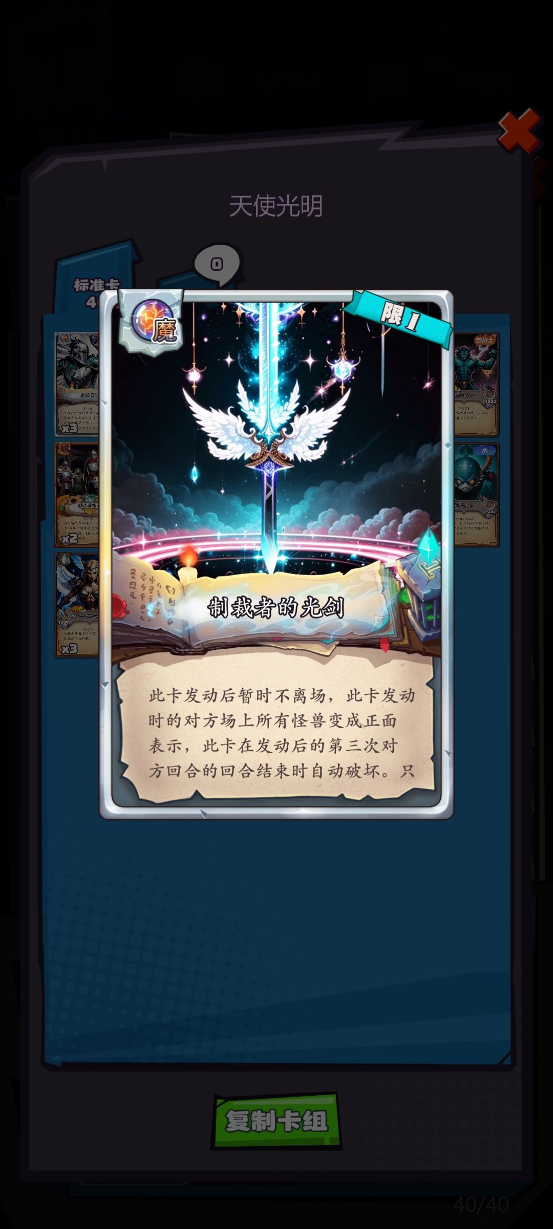 高功光明天使怪兽卡带满,螃蟹带1到2个都行防守用还不错,魔法典配合光剑,让你可以存活好久。宣言反制别人的K卡,挺好用。闹钟就是给没有反射镜的我用的,当然你有反射镜就不用闹钟了。圣杯最好不要轻易用容易被破坏,最好配合闹闹用!六芒星阵也可以让你多一个选择!毕竟宣言就2个!