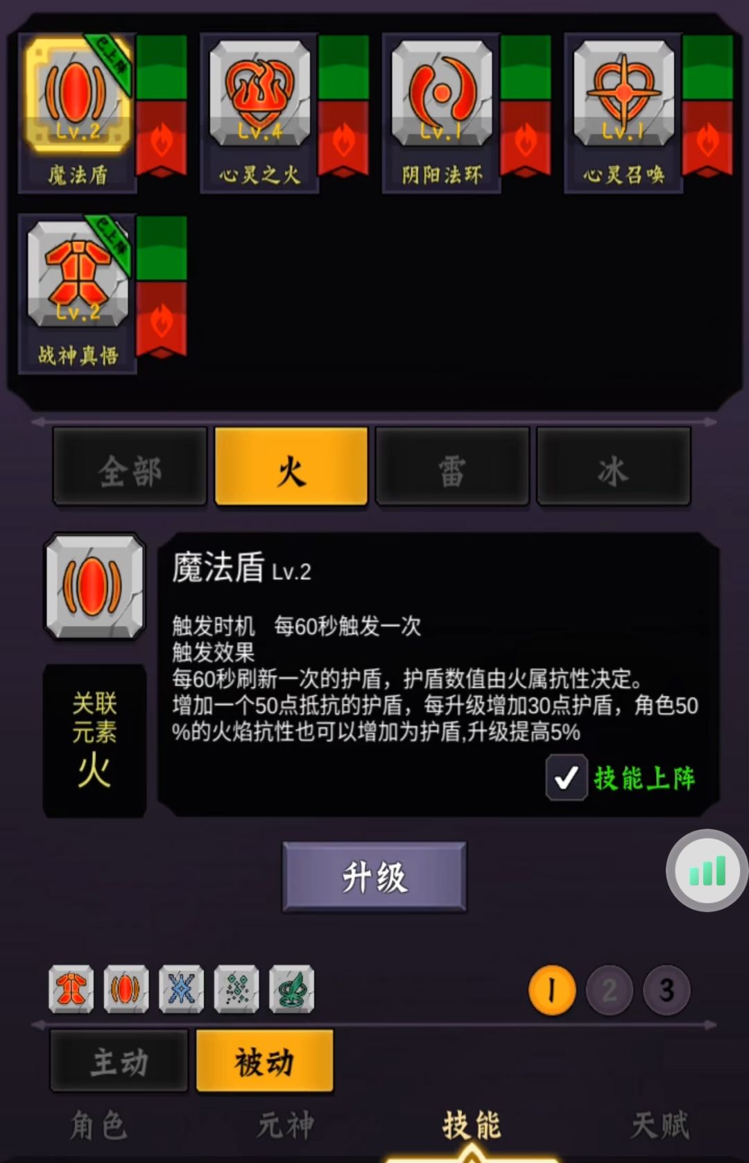 魔法盾 增加一个50点抵抗的护盾,每升级增加30点护盾,角色50%的火焰抗性也可以增加为护盾,升级提高5%