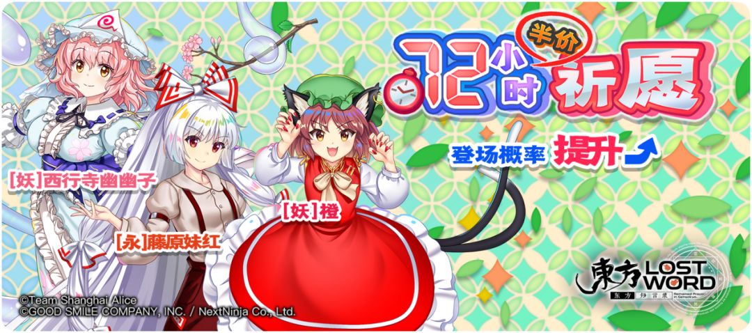 祈愿概率UP角色:[妖]西行寺幽幽子、[永]藤原妹红、[妖]橙