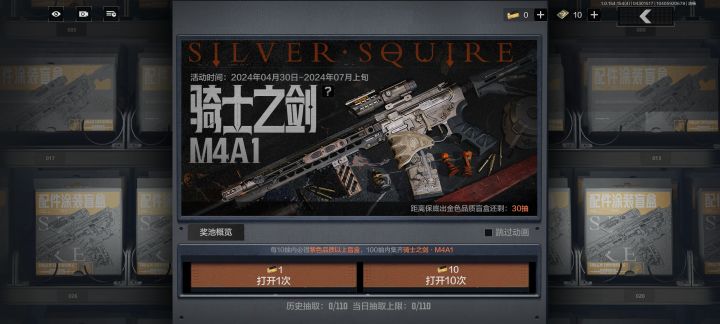 “骑士之剑”这是一个新的抽奖活动。里面是m4 A1的皮肤。这个枪的造型也是很酷炫的,而且里面又有很多配件的皮肤。本次活动也是拥有保底,只需要100抽即可拥有该皮肤。价格也是非常的昂贵。但是这把枪的外形和配件组装到一起也是非常的酷炫。作为收藏和实用也是很不错的。