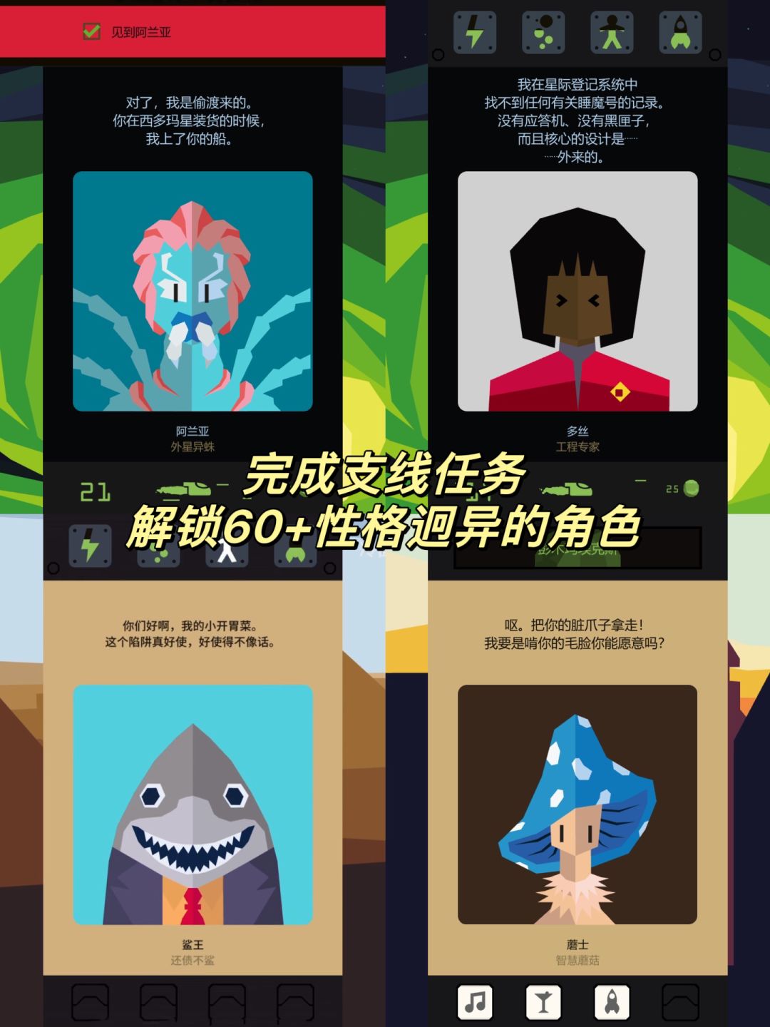 🛸 一路上会遇到很多新的伙伴,飞船上集结了越来越多的乘客。当然,你需要平衡船上的各项资源,确保旅程中所有成员各司其职。小心划哦,毕竟划错一步就要与群星共眠了🤣!