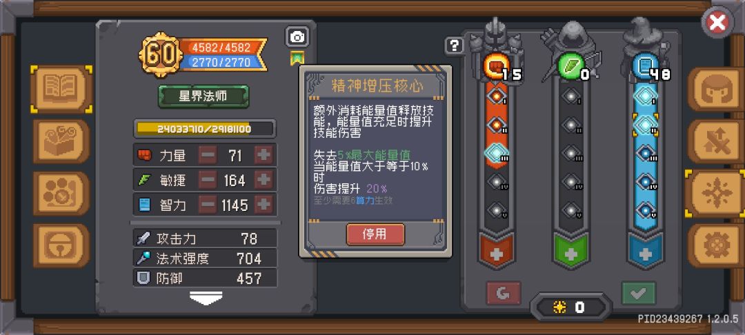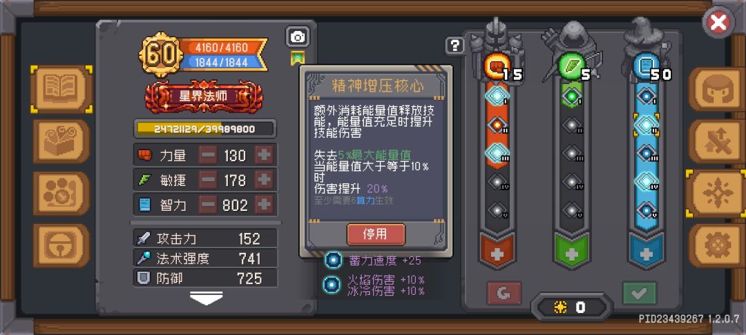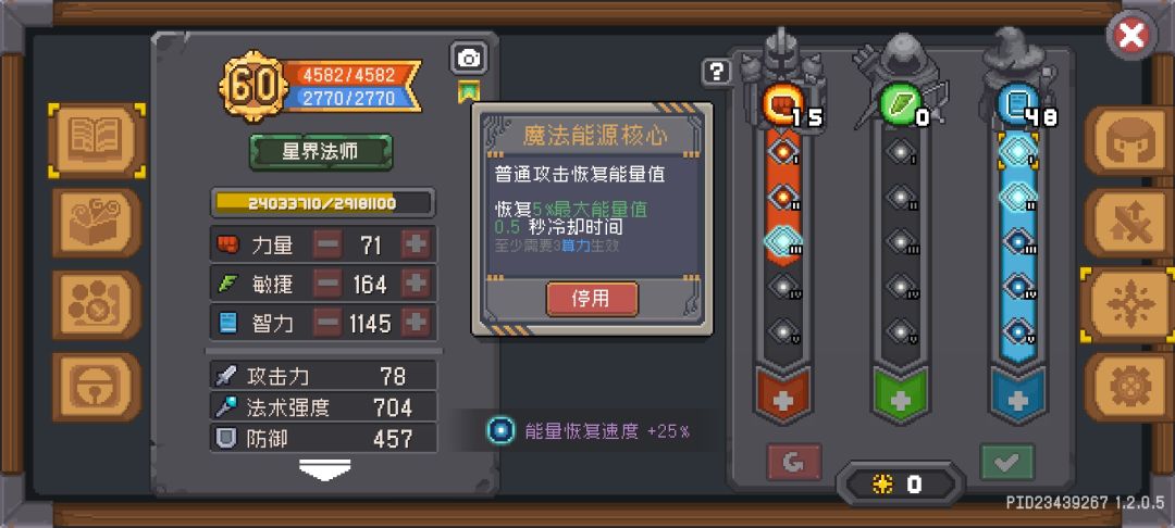 属性点我是全智力,我巅峰才70,智力点了50,力量点了15为了开节点,中间点着玩,因为没啥好点的,要是你巅峰满了,那就25-25-50,节点看着来,但是智力二节点是必备的,效果如下图,可以让你迅速耗蓝开技能。