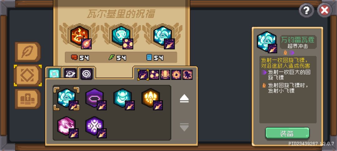瓦尔基里的祝福还是为了叠识海无垠来选择,我测试了一下,不知道为啥,瓦尔基里里的毒系伤害和光系伤害不能叠识海无垠的层数,暗系好像也不能。因此就只剩下火,冰,电。上边这个火技能只有炸的那一下能叠;冰就是砸下来能叠;电飞镖这个只有大飞镖打到才能叠,小飞镖不行,但是它很帅!至于用哪三个技能这个无所谓,但是不同技能身上的瓦尔基里祝福效果有些差异,具体可以自行查看更改选择。