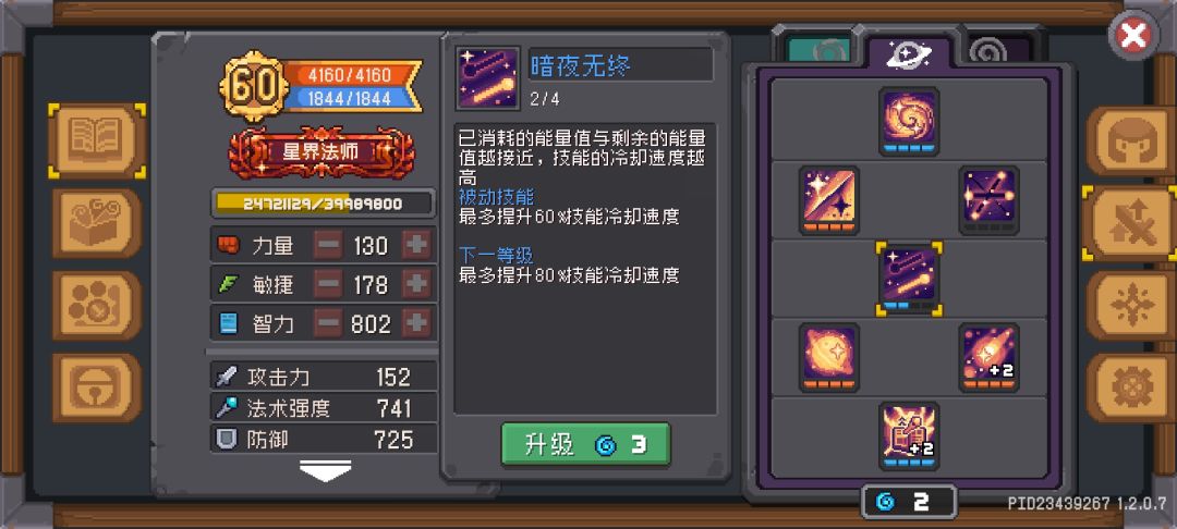 中间技能页还要点满深空无尽(提供附加黑暗异常上限,包括自己给自己上的和给怪上的,当给自己上的异常满了就暂时不能释放右边页的主动技能,除非装备带有黑暗异常免疫词条);由于评论区有大佬讲解了技能冷却缩减机制,简单来说就是冷却越高收益越少,因此冷却叠一定程度就行了,所以我暗夜无终(点满最高提供100%冷却,实际上我读不太明白它的意思,字面意思应该是蓝条黑色和蓝色越接近冷却加成越高,但是我发现空蓝条时候才是最高的,所以我就不知道到底是描述有问题还是啥)只点了两点,刚好腾出点数点满右边的暗夜星光(就是那个东皇一技能)。冷却到了一定程度,陨石☄️可以哐哐一直砸简直不要太爽!