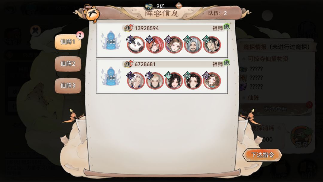 每个仙盟的成员可提供最多3支队伍,作为仙阵的基础战斗单元。盟主和副盟主负责挑选这些队伍,构建成一个防守仙阵(最多含30支队伍)和三个进攻仙阵(合计不超过30支队伍)。