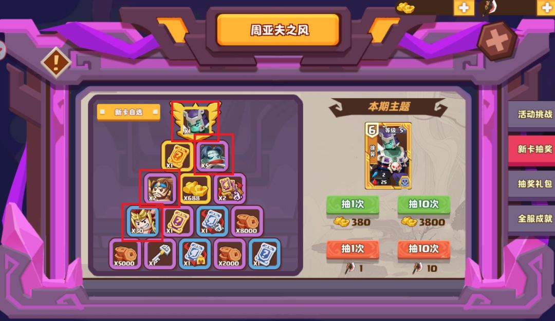 红圈中的卡牌都是主公可以自选的,主公可在对应框中选择相同品质的将士/技能,除最新英雄徐晃外,还可以抽取其他尚未获得的传说将士或传说技能哦~