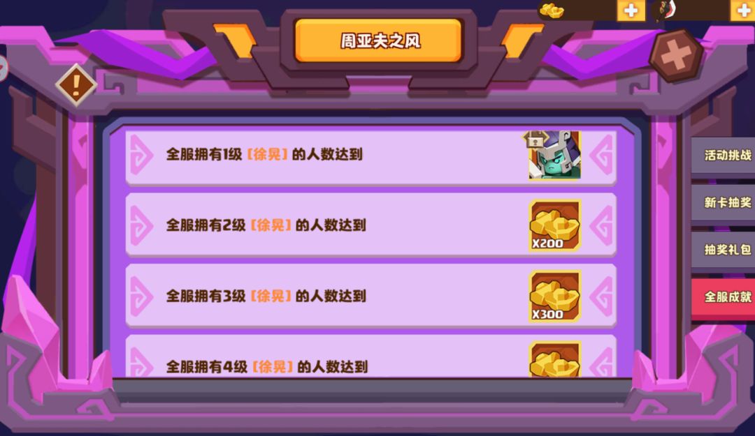 为了各位主公都能早日获得全新将士,本次活动还开启了《全服成就》。当全服获得【徐晃】的主公到达一定人数后,全服都可获得元宝、【大斧】等丰厚奖励。
