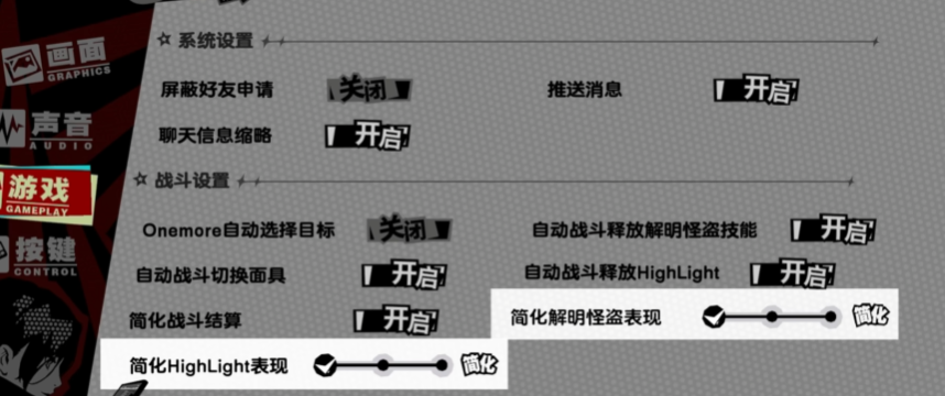 首先是设置页面,大家可以把简化解明怪盗表现和简化Highlight都拉到最左边,这样我们战斗中,辅助位放技能或者角色放大招的时候,可以直接跳过动画,让你的战斗更流畅爽快,当然,颜值视觉党,或者喜欢看技能动作的小伙伴就不要调整了哈!