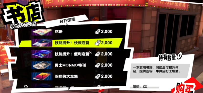 去新宿的书店,购买《甜点制作秘诀》、《技能提升!快餐店篇》、《技能提升!便利店篇》,等下次做读书日程任务的时候,就可以选择这三本书来阅读,除了能获得知识指数之外,还可以让你在打工时涨工资!