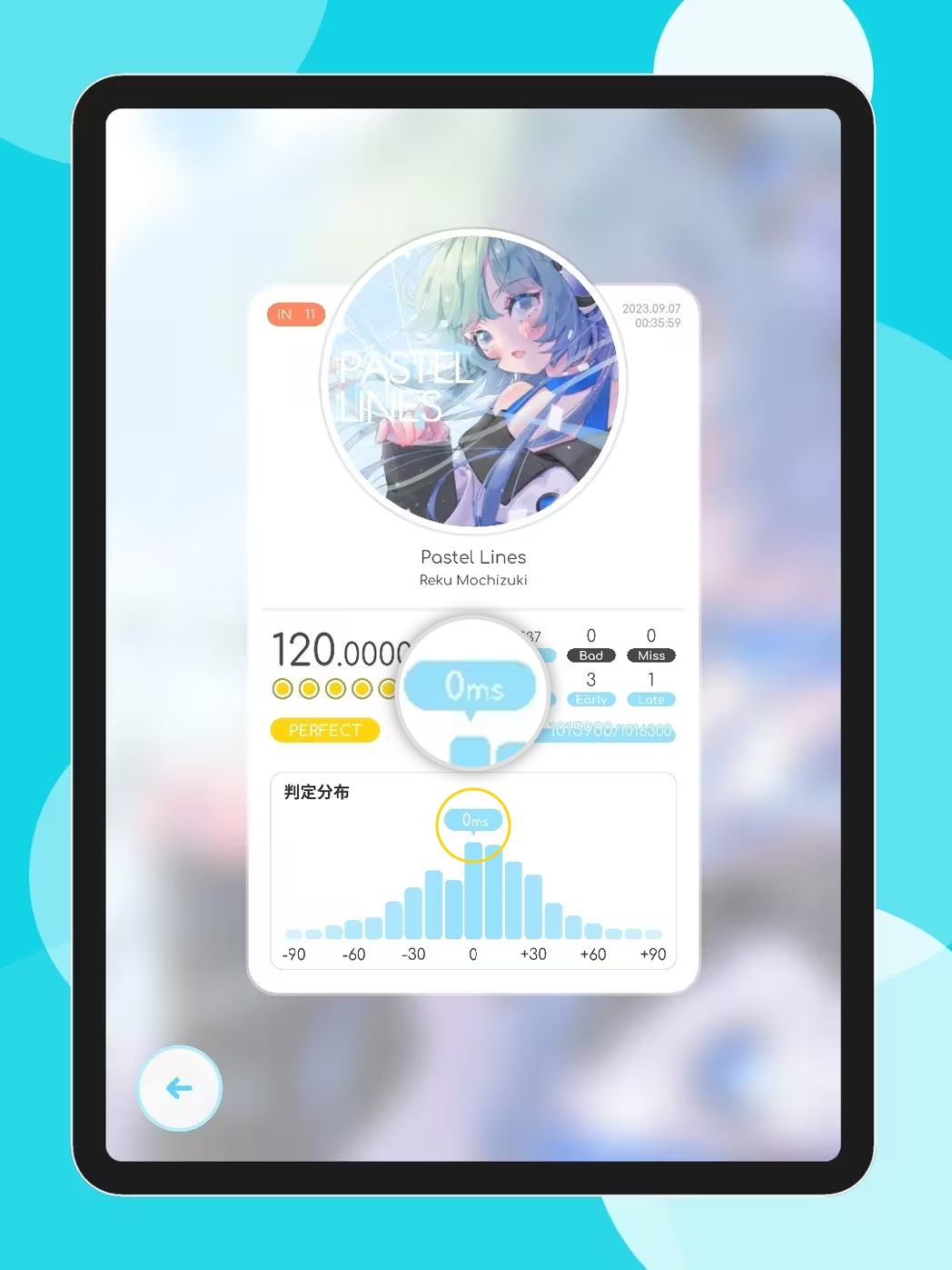 查看“判定分布”柱状图上方的气泡,它是帮助你调整谱面偏移的好帮手!跟着正负数字在设置里调整你的判定偏移吧!(如果显示+20ms,则在设置中向右拉判定偏移20ms即可对准!)