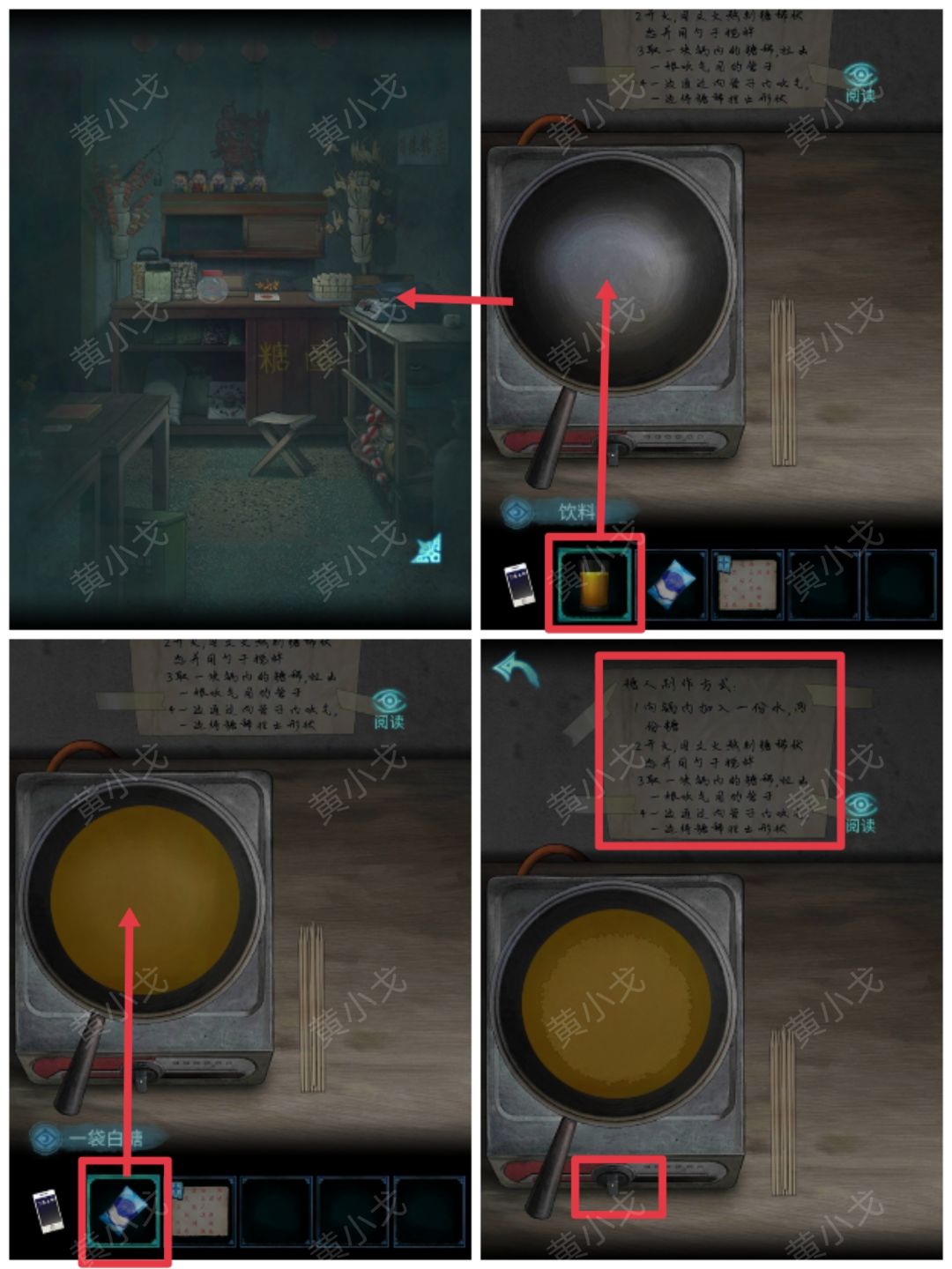 15.点击柜子上的锅,根据贴在墙上的糖人制作方式,把【饮料】和【一包白糖】倒入锅里;开火熬煮