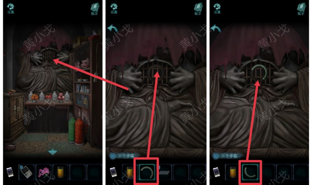 1.(糖人店-里间)点击大雕像,把两个【半个手镯】放入凹槽中