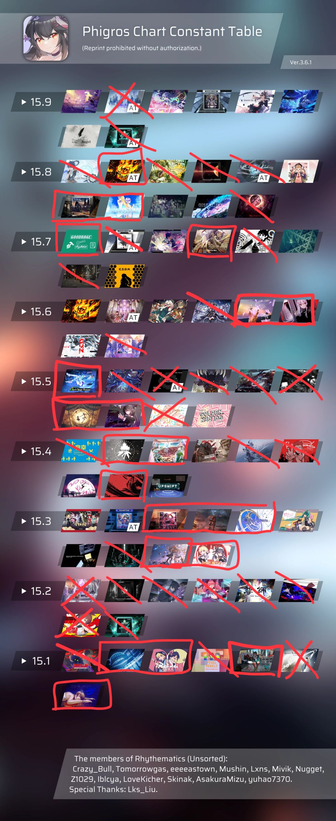 15难度曲目推荐统计在一张图上(并写出曲目名字),圈起来的为推荐,划掉的不推荐,没有改动的则需要您擅长哪个提升哪个。(推荐图片在贴子底部)