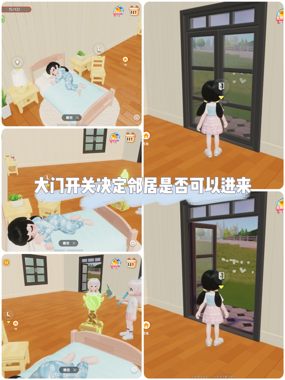 当我砍树采集把体力耗完之后,回家里去床上休息回体力,由于大门没有关,等我再回来一看,好家伙,两个邻居提着斧子围在我床边,我瑟瑟发抖,不知道自己此时该不该醒来哈哈哈,随后她们就在沙发上坐下了。这时候我才知道,原来入户门也可以开关。等我家布置的更好看,一定要邀请邻居来做客!