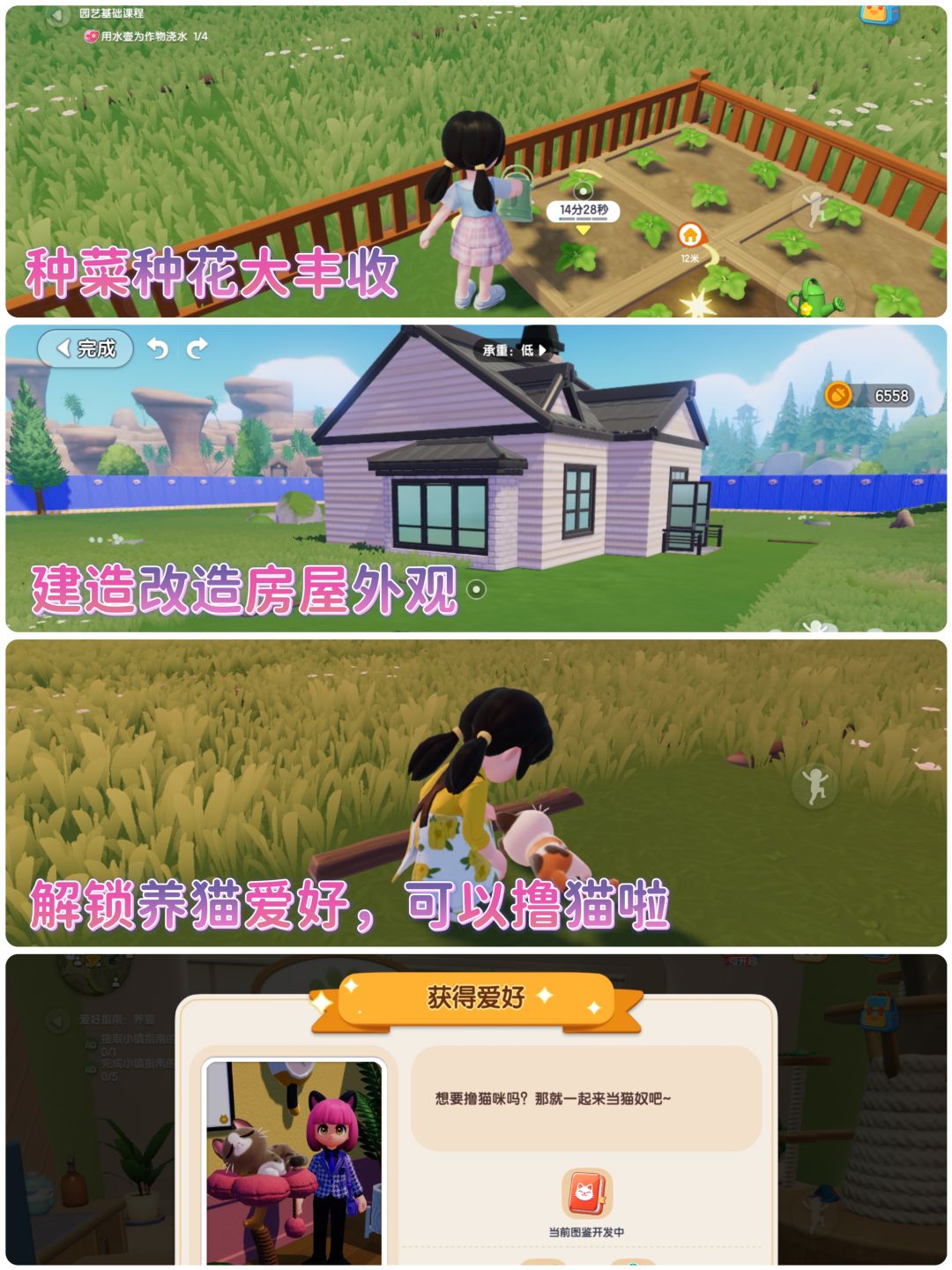 在这里,可以解锁非常多的兴趣爱好,有钓鱼、烹饪、养猫、园艺、捕虫、观鸟等多种爱好。家园土地和房屋可以自由建造,家具随心摆放,可以选择按照网格摆放,也可以打开“精细摆放”按钮来摆脱网格限制。
