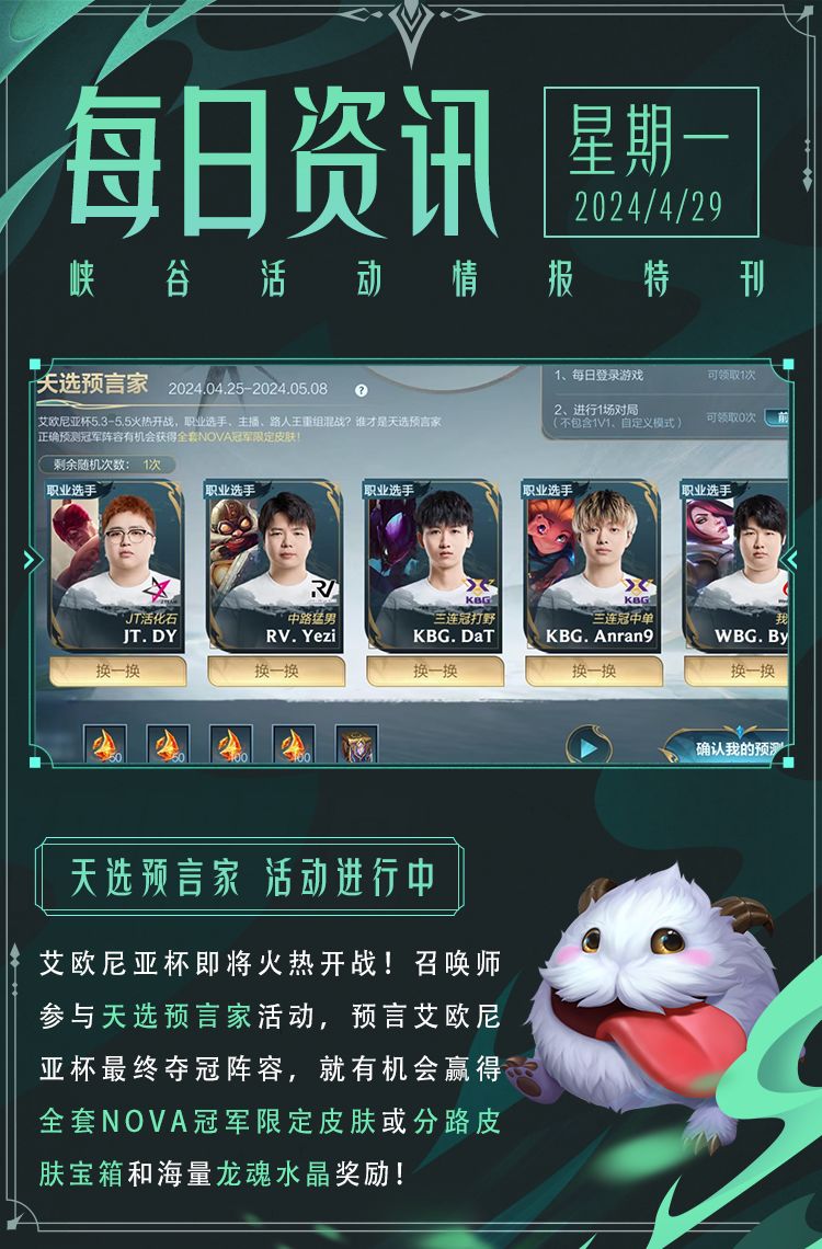 参与“天选预言家”活动,领电竞个性化道具和龙魂水晶*300好礼;而截止至5月2日,正确预言冠军阵容就有机会获得全套NOVA冠军限定皮肤或精选分路皮肤宝箱!
