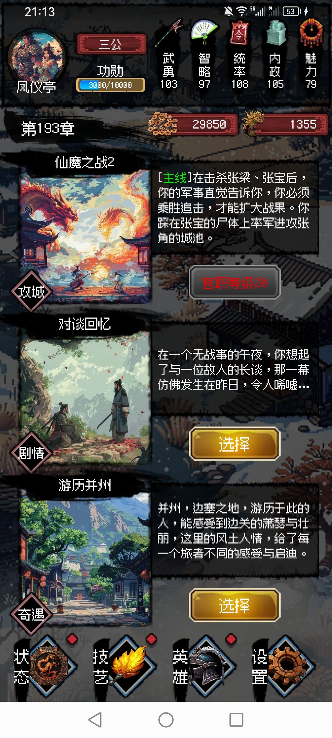 再来说说文武侧重,173章的尸鬼大军剧情需要70章左右武力,174章左右需要16阶官职,183章左右需要18阶官职,185章左右需要80内政,190章之后则和所有结局一样需要53魅力和20章官职。